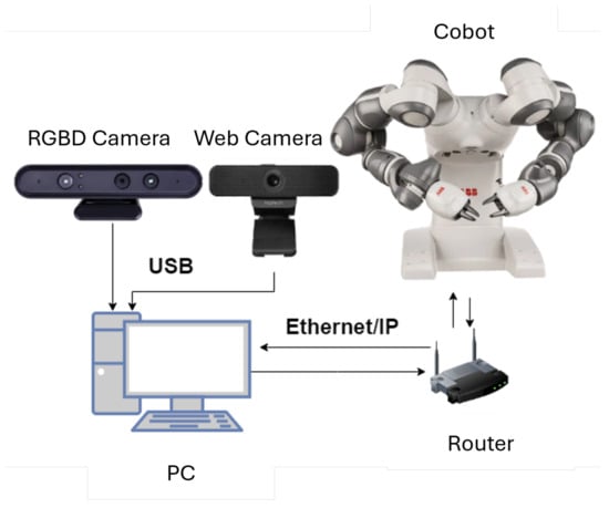 The Kinect v2 RGBD camera (Microsoft Corporation, Redmond, WA, USA) was utilized in [31] to facilitate gesture recognition. Their application identified gestures based on the positioning of the operator’s arms and hands, focusing on static gestures. For voice control, the Kinect v2 was configured as the default microphone on the computer, with voice commands being converted into text and matched against a predefined dictionary. These recognized commands were then mapped to signals that control the ABB IRB 120 robot (ABB Inc. Robotics & Discrete Automation, Auburn Hills, MI, USA). The control program for the robot was developed using the RAPID language within the RobotStudio environment.