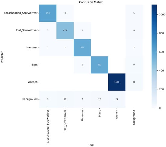 The qualitative assessment indicates that YOLOv8 outperforms other models for the specific application. YOLACT, in contrast, demonstrated significant limitations, particularly in its sensitivity to tool rotation on the workbench, leading to unreliable detection. Although YOLOv5 was initially trained, it exhibited notable issues with detecting a flat screwdriver, often misidentifying it as a Phillips screwdriver, and also performed poorly in image segmentation. The results suggest that with an adequately large and high-quality dataset, YOLOv8 could be trained to achieve reliable tool rotation calculations on the workbench. This improvement would enable the robot to consistently and accurately pick up and deliver the correctly oriented tool to the operator. A comparison of the segmentation results for the trained models is presented in Figure 7. Confusion matrix for the YOLOv8 model is shown in Figure 8 and hyperparameters used during training are shown in Table 2. The final decision to implement YOLOv8 was based on its superior performance compared to YOLOv5, YOLOv7, and YOLACT, as demonstrated in our evaluation. Among the tested models, YOLOv8 achieved the best results for object segmentation, as illustrated in Figure 7.