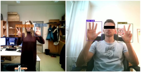 - Kapitanov, A.; Kvanchiani, K.; Nagaev, A.; Kraynov, R.; Makhliarchuk, A. HaGRID–HFurthermore, Gesture Recognition Image Dataset. In Proceedings of the IEEE/CVF Winter Conference on Applications of Computer Vision, Waikoloa, HI, USA, 3–8 January 2024; pp. 4572–4581. [Google Scholar]
