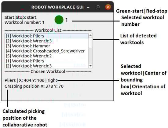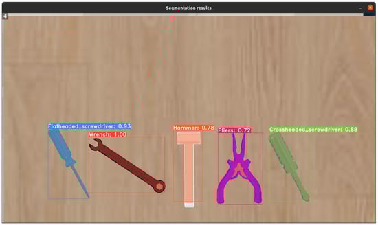 In the analysis of the current state of the problem (Section 2), it was identified that RGBD cameras are most frequently used for both gesture and object detection. These cameras, which combine color and depth imaging, provide comprehensive information that is particularly beneficial for tasks involving object recognition and localization in three-dimensional space. The objective of the design is to simplify the work environment and enhance the efficiency of managing the cobot. However, in the current approach, depth information acquired by the RGBD camera was not utilized for tool segmentation. The system exclusively relied on visual data from the RGB camera for detecting and recognizing tools. While depth data could potentially enhance segmentation accuracy, particularly in more complex or occluded scenarios, it was not incorporated into the present framework. Future work might explore the integration of depth information to improve segmentation and object recognition, particularly in environments where depth cues can aid in distinguishing objects in cluttered or dynamic scenes.