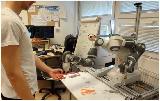 The workplace setup consists of a desk and two cameras: one focused on the desk for object detection and the other dedicated to capturing the operator’s gestures. A comparable setup was developed by the authors in [49], who utilized two collaborative robotic arms in their design. The layout of the robotic workspace, as modeled in the ABB RobotStudio simulation software (ver. 2021), is depicted in Figure 2 [50].