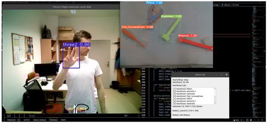 Fully integrated within the ROS 2 framework, the system ensures seamless interaction and control. Its novelty lies in the fusion of advanced computer vision with collaborative robotics to perform complex tasks in dynamic environments. Through rigorous testing, the system has demonstrated reliable tool-feeding capabilities and operator gesture recognition, marking a significant advancement in intelligent robotic systems and paving the way for future innovations in human–robot collaboration.