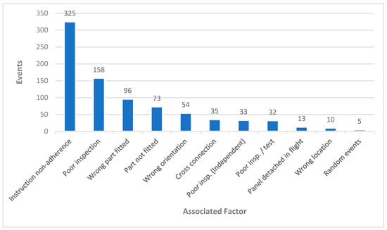 The Corporate Aircraft Association (CCA) published a paper [10] in 2016 on Aircraft Maintenance Incident Analysis. The paper highlighted various error types in large aircraft maintenance. Approximately 72% of the reported events involved installation errors and failure to follow specific instructions for task completion. A broader analysis of the associated factors causing installation errors (834) showed that poor inspection was the main factor in many cases, including 223 events in total (please refer to Figure 2).