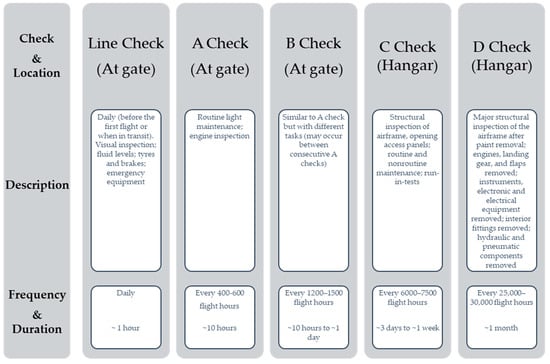 The Federal Aviation Administration (FAA) obliges airlines to prepare a mandatory maintenance programme called the Continuous Airworthiness Maintenance Program (CAMP). This process covers day-to-day and detailed inspections called “checks”. From lighter to most thorough, there are four levels of checks: A, B, C, and D [12]. Saltoglu et al. [13] provided a summary table (Figure 3) of all four checks, including a brief description, the location, and the frequency/duration for each, arranged in order of increasing complexity.