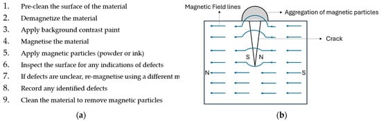 (a) Magnetic Particle Inspection testing method [43]; (b) Magnetic Particle Inspection working principle of MPI [44].