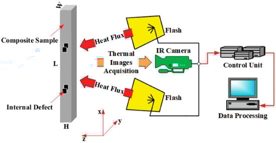Alhammad et al. [50] introduced multi-label classification algorithms designed to predict multiple factors simultaneously from thermal images gathered through active thermography, specifically Pulsed Thermography (PT). A total of 24,000 thermal images were captured under various conditions using different geometrically shaped composite material specimens, which were then used to train machine learning models for classification. The measurement system included an X6900 FLIR (Teledyne FLIR LLC, Wilsonville, OR, USA) infrared camera equipped with an InSb-CCD Matrix Sensor, two Fx60 (Balcar, France) photographic flashes that generated a heat flux for a duration of 2 milliseconds, a control unit to synchronise data acquisition with pulse generation and a data processing unit (Figure 6).