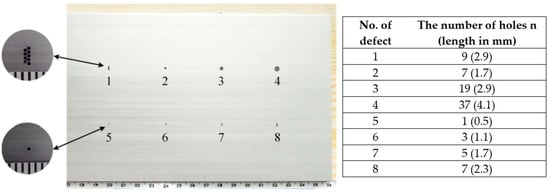 Eddy Current [37,38,39] is a non-invasive inspection technology based on conductivity, designed to detect surface and near-surface defects. It is highly automated and time-efficient, making it a capable choice for certain applications. A great advantage of this method is that it does not require a couplant between the inspection system and the object. Nevertheless, it is restricted to conductive materials and may sometimes provide inconsistent results, leading to potential confusion. The most common type of defect that Eddy Current can effectively detect is a crack. In 2024, Lysenko et al. [46] evaluated Eddy Current Array (ECA) technology, focusing on aircraft specimens with artificially induced defects of various types, orientations, and sizes to simulate real-world conditions. The study aimed to assess how effective, sensitive, and reliable this technology was in detecting and characterising surface and subsurface defects in aircraft structures. The author also analysed the key factors impacting the performance of this technology, including advantages and limitations. A 360 mm by 120 mm aluminium alloy 31T5 (AD31T5) specimen was fabricated for the experiments, featuring multiple circular defects with varying cluster densities, each with a depth of 4 mm and a diameter of 0.5 mm. This alloy is widely used in the aviation construction industry. A key focus of the study was to assess the ability of ECA technology to detect small defects. For the experiment, the researchers used the Olympus Omniscan MX eddy current flaw detector with a matrix-type eddy current sensor. Due to its flexibility, this sensor could be attached to multiple geometry surfaces, flat or with curves. The results showed that the system could detect clusters of holes; however, it was challenging to detect single holes with such a small diameter of 0.5 mm. Careful calibration of the system, particularly by adjusting sensitivity levels, was crucial to enhance the visibility of defects. This process was challenging, as increasing sensitivity introduced more noise, leading to false positives. In other words, the system mistakenly identified non-defective areas as defective due to the added noise.