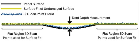 Another robotized system was introduced by Reyno et al. [20], who proposed a 3D scanning system capable of detecting surface damages during semi-automated aircraft inspections. Specifically, this technology could inspect in-service honeycomb sandwich panels and accurately detect and characterise dents. This promising approach could estimate dent depth with a false error rate within 0.04 ± 0.06 mm. The preferred point cloud acquisition system was the FARO® (Lake Mary, FL, USA) Edge 3D scanning system, consisting of a FARO Laser Line Probe and SmartArm (Toronto, ON, Canada) technology.