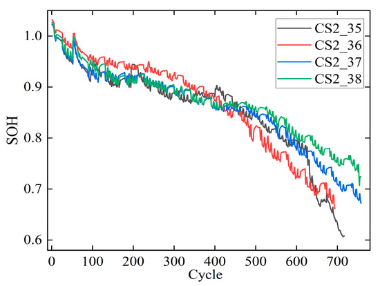 As the number of charge–discharge cycles increases, the maximum usable capacity of LIBs gradually decreases, and the internal resistance increases [25]. SOH of LIBs is typically defined in terms of either capacity or internal resistance [26]. The SOH, serving as a key metric for quantifying LIBs degradation, is primarily characterized by capacity fade analysis, as defined below: