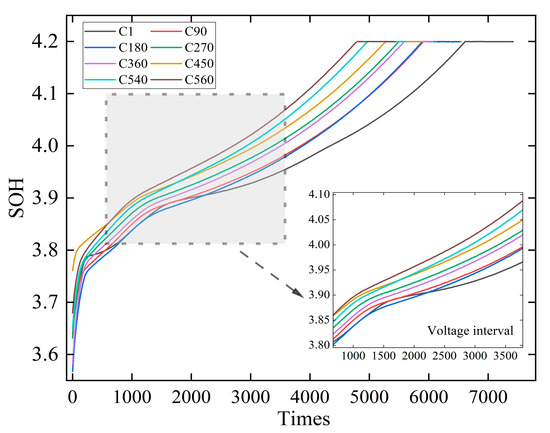 As the number of charge–discharge cycles increases, the available chargeable and dischargeable energy in the battery gradually decreases. The energy value can reflect the electrochemical reaction activity of the battery during the charging process. As shown in Figure 2, with battery aging, the electrochemical reaction activity declines, leading to a reduction in the constant-voltage charging energy. To reflect the SOH of the battery, the energy difference during constant-voltage charging (EDCV) is used as health feature 4 (HF4).