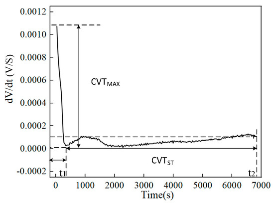 The second-order processing curve of the battery is derived by differentiating the monitoring data recorded by the BMS. The dV/dt curve during the constant current charging phase, as shown in Figure 3, provides a more intuitive visualization of the rate of voltage change per unit of time during the charging process [31]. From the perspective of the battery’s internal mechanisms, as SOH declines, both the positive and negative electrode active materials and lithium-ions are progressively lost, leading to reduced charge capacity. During charging, this manifests as a decrease in the voltage rise rate and a shortening of the stable charging time. Therefore, the maximum value of the voltage change rate during charging, as shown in Figure 3 (maximum value of dV/dt, CVTMAX), is chosen as health feature 7 (HF7), and the duration of the stable voltage change rate during the constant voltage charging phase (Stable Time of dV/dt, CVTST) is chosen as health feature 8 (HF8).