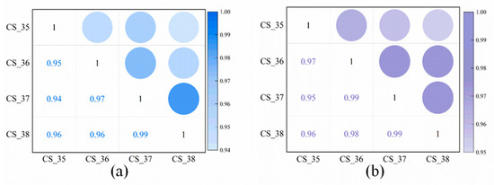 Dual correlation coefficients of SOH among four batteries. (a) Pearson correlation coefficient; (b) Spearman correlation coefficient.