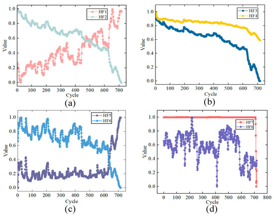 Normalization of various HFs. (a) HF1, HF2; (b) HF3, HF4; (c) HF5, HF6; (d) HF7, HF8.