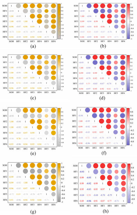 Heatmap of the dual correlation of health features for four batteries. (a) CS2_35 HFs Pearson correlation; (b) CS2_35 HFs Spearman correlation; (c) CS2_36 HFs Pearson correlation; (d) CS2_36 HFs Spearman correlation; (e) CS2_37 HFs Pearson correlation; (f) CS2_37 HFs Spearman correlation; (g) CS2_38 HFs Pearson correlation; (h) CS2_38 HFs Spearman correlation.