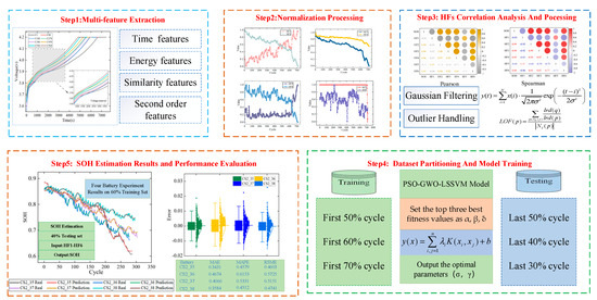 As shown in Figure 8, this section outlines an SOH prediction framework using the PSO–GWO–LSSVM model. Step 1: Extract eight features from the charging voltage profiles. Step 2: Normalize processing for eight HFs. Step 3: Analyze the HFs correlations and handle outliers with Gaussian filtering and LOF. Step 4: Train the model using the training set and optimize LSSVM hyperparameters with PSO–GWO. Step 5: Predict SOH and evaluate performance for four battery estimation results.