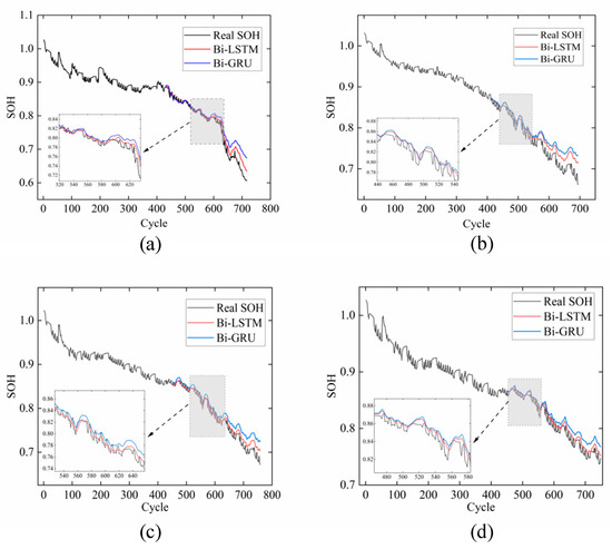Comparison of prediction results for different batteries using RNN methods. SOH prediction results of (a) CS2_35; (b) CS2_36; (c) CS2_37; (d) CS2_38.