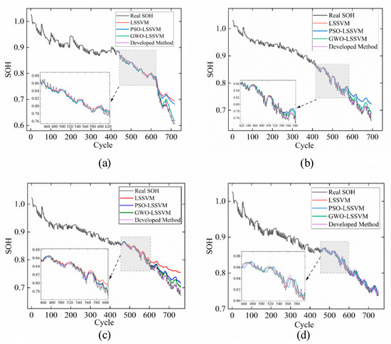 To validate the effectiveness of the proposed model, we compare its SOH predictions with those from LSSVM, PSO–LSSVM, and GWO–LSSVM, using 60% of each battery’s data for training and 40% for testing. The kernel parameter and regularization parameter are key hyperparameters in LSSVM that play a decisive role in the overall performance of the model. The PSO–GWO algorithm optimizes these critical hyperparameters to obtain their optimal values, thereby enhancing the model’s prediction accuracy for battery SOH. For example, the CS2_38 battery’s particle dimension for PSO, GWO, and PSO–GWO was set to 2, with a population size of 20 and 50 iterations. The regularization parameter for the single LSSVM model was set to 25, and the radial basis kernel parameter was set to 50. The specific parameter settings for the PSO–GWO–LSSVM model are shown in Table 5.