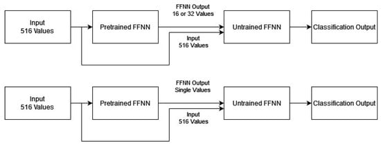 Transfer learning–stacked generalization was introduced in the following manner: (a) the output (single or multiple value) of one pretrained FFNN was used as an input to a second, untrained FFNN (Figure 2); (b) the output (single or multiple value) from the pretrained FFNN was combined to the input of the MEG data to the untrained FFNN (Figure 3); (c) the single-value classification output from several pretrained FFNNs was combined to an input of the MEG data to the untrained FFNN (Figure 4); or, (d) a chain was built with FFNNs trained by a combination of the MEG data and the output of the previous FFNN model (Figure 5).