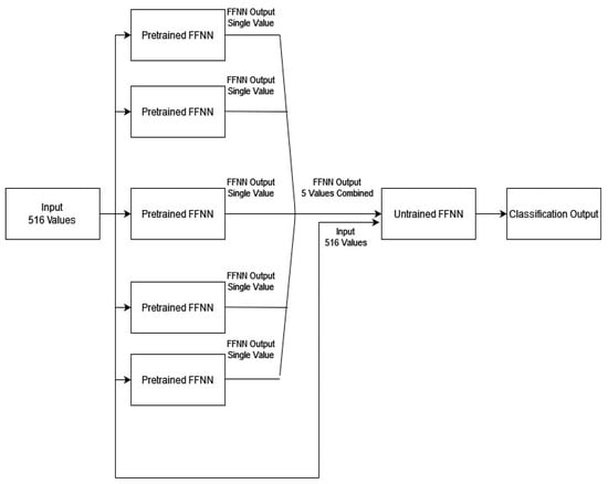The experiments in Group IX are adequately described by Figure 4. Five FFNNs are pretrained separately on the Train-Set and then are used to produce a single-value output each, which is the classification result for each item in the Train-Set. These five outputs are combined with the original Train-Set (516 Columns) into a new 521-column matrix which is used to train the untrained FFNN. Then, the Validation-Set is used on the five pretrained models in the same manner to produce a 521-column Validation-Set for the final FFNN, which gives us the classification output.