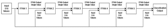 In Group VIII, we use a serial chain of five FFNNs. The first FFNN is pretrained on the Train-Set data, the 516-column matrix (256 values of the signal samples and 260 values obtained from the ST-FFT). All the subsequent FFNN models are trained on the classification output of the previous model on the Train-Set combined with the initial Train-Set, as explained earlier (lines 256–279) and as shown in Figure 3. After all FFNN models are sequentially trained on the Train-Set, we use the Validation-Set as the input to the chain. Each FFNN produces a classification output that is combined with the initial Validation-Set and fed to the next FFNN. The output of the final FFNN is the final classification output, which we expect to be more accurate than the output of the first FFNN. In the process, we measure each model’s accuracy to see the overall progress step by step.