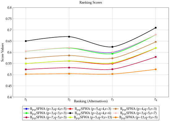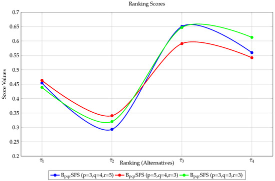Ali and Naeem [12] proposed a new extension of T-SFS, called r,s,t-spherical fuzzy sets (srt-SFSs), which lift all restrictions inflicted by classical sets. Equivalently, Rahim et al. [13] introduced the concept of pqr-spherical fuzzy sets (pqr-SFSs) with little restriction. We follow the latter notation in this work. In pqr-SFSs, the triplet (MD, NMD, and ¬MD) is constrained according to , where are +ve integers with . The pqr-SFSs have been studied in several manners by several researchers; see [14,15]. Karaaslan and Karamaz [16] also extended this concept to interval-valued pqr-spherical fuzzy sets.