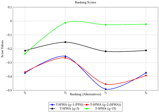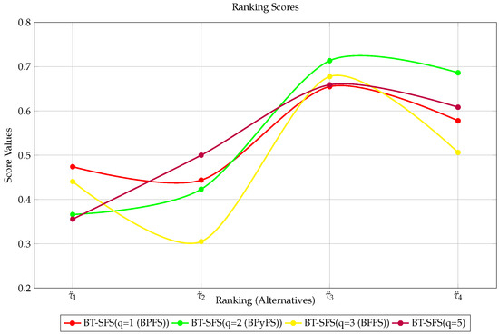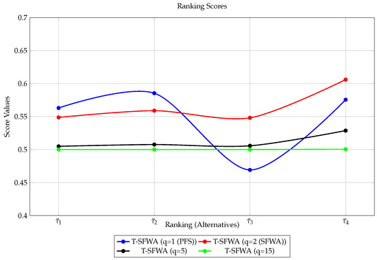 Mahmood et al. [9] extended SFSs to T-spherical FSs (T-SFSs), where , for some integer . Such an arrangement affords the decision-makers flexibility in assigning any MD, NMD, or ¬MD value inside . For instance, if we take , and MD , NMD , and ¬MD , we obtain . Ullah et al. [11] introduced and defined the term ’correlation coefficients of T-SFS’, where levels of membership degrees of the terms should meet the constraints, i.e., . This assumes homogeneity in the levels of MD, NMD, and ¬MD. In actual scenarios, these levels might differ. So, if a decision-maker sets MD , NMD , and ¬MD , for instance, we see that implies this violate linearly aggregation rule. So, a more nuanced approach is needed. Enabling different term levels for MD, NMD, and ¬MD makes it possible to reflect the multi-factorial reality.
