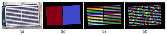Example VHR imagery of two PV systems, where (a) is the raw color image, where various methods can detect either (b) PV systems (low granularity), (c) individual PV arrays (medium granularity), or (d) individual PV modules (high granularity). The colors represent individual instances of detected PV arrays or modules.