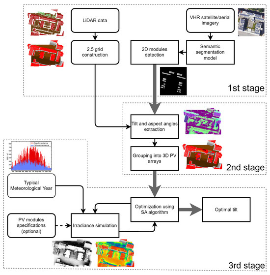In this paper, the challenge of optimizing the tilt angles of existing PV arrays’ installation by fusing airborne 3D LiDAR point cloud data and VHR imagery data is addressed. To the best of the authors’ knowledge, this is the first work to tackle this challenge using widely available remote sensing data sources. The proposed method not only improves the accuracy of the estimated production and capacity of PV-based electrical energy for existing installations, but also enables the optimization of the tilt angles using a simulation-driven method. This also helps to determine whether existing installations already employ optimal angles or if there is significant room for improvement. For fusing VHR with 3D airborne LiDAR, the detection of 2D individual PV modules in VHR data by using a semantic segmentation model is utilized. Then, a topological structure over the LiDAR point cloud is established, which enables the estimation of each PV module’s slope (inclination) and aspect (orientation) angles, and allows subsequent 3D reconstruction after the consideration of 2D PV module detection from VHR. Finally, to find the optimal tilt angles of the 3D PV modules grouped into 3D PV arrays, an optimization algorithm coupled with irradiance simulation is utilized for each module in the optimization iteration. Thus, the primary novelties over related work are as follows: