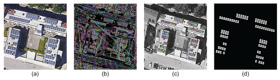Steps to create ground truth data for module detection: (a) input VHR image, (b) image preprocessing, (c) detection of contours, and (d) filtering and thresholding for creating module masks, which are further manually processed.