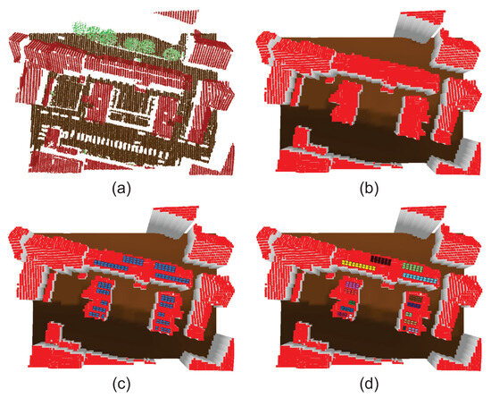 Visualization of example 3D reconstruction and grouping of modules: (a) raw classified point cloud data into terrain, buildings, and vegetation; (b) constructed 2.5D grid; (c) reconstruction of 3D modules; (d) colored by DBSCAN-based grouping (i.e., for each array).