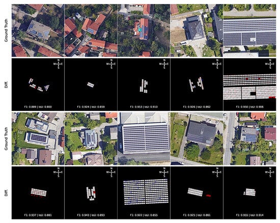 Inference results on sample images from the testing dataset, where the 1st and 3rd rows show the original satellite imagery, while the 2nd and 4th rows show the difference between the ground truth masks of detected modules and the results of detection using an FT-UnetFormer model with corresponding IoU and F1 metrics per image. The red and blue colors indicate overprediction and underprediction, respectively.