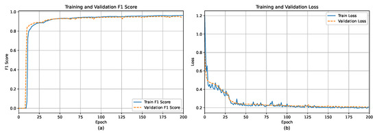Results of the FT-UnetFormer with SwinTransformer model regarding per-epoch change of (a) F1 score and (b) learning loss for training and validation data, respectively.