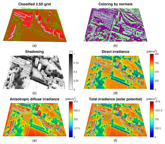 Visualization of validation site in Maribor, Slovenia, where (a) is the constructed 2.5D classified grid from LiDAR data, (b) is the estimated normal vectors over the grid, (c) is the simulated average hourly shadowing per annum, and (d–f) present simulated average hourly direct, diffuse, and total irradiances per annum.