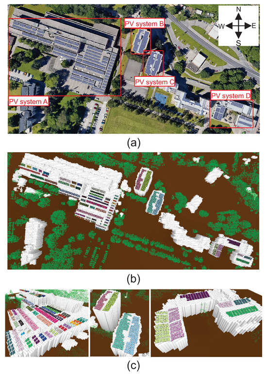 Validation site in Maribor, Slovenia, where (a) is a satellite imagery of the site with annotations of the considered PV systems, (b) is reconstructed 3D arrays over 2.5D grid from airborne LiDAR and VHR data, and (c) is a zoom-in into the given PV systems.