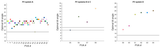 Optimal tilt estimated with the proposed method for each array for all four PV systems. The black lines represent the real slopes used by the arrays within the given PV system. Colors of the arrays correspond to colors in Figure 8b.