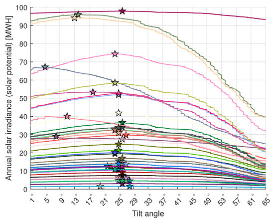 Estimated total annual solar irradiance per detected array by changing the tilt angle with an exhaustive method. The stars denote the optimum tilt angles for a given PV array, where the received solar irradiance is maximized.