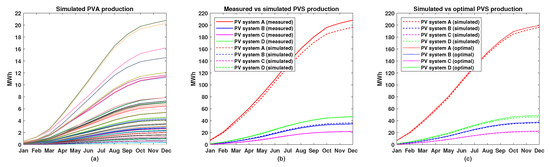 (a) Simulated cumulative electrical energy production from individual arrays, where the colors correspond to colors in Figure 8b,c; (b) comparison between cumulative measured and simulated electrical energy production from the four PV systems; and (c) comparison between cumulative simulated and optimal electrical energy production from the four PV systems.