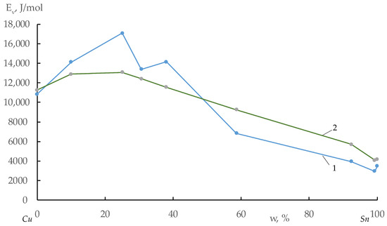 | N | Cu-Sn Alloy, w, % | A, mPa·s | Eν, J/mole | Tliq, K | ΔmixH, J/mole | ΔchH = RTliq + ΔmixH |