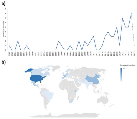 The first publication on this topic dates back to 1982 [83], with only four articles being published between 1982 and 1988. However, no further publications were recorded until 1999, followed by a steady average of two articles per year until 2011. From 2015 onward, interest in this subject increased annually, with three articles published in 2015 and eight articles in 2024, the latter marking the highest number of publications to date (Figure 1a).