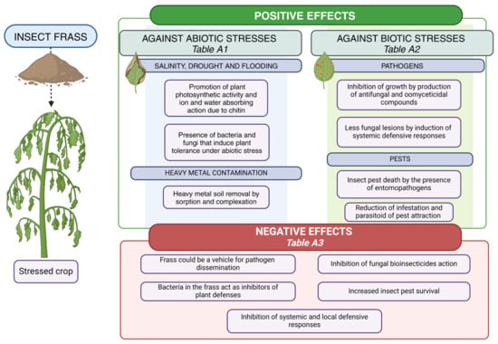 Summary infographic showing all the positive and negative effects of insect frass in its use in agriculture, in relation to abiotic and biotic plant stresses.