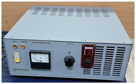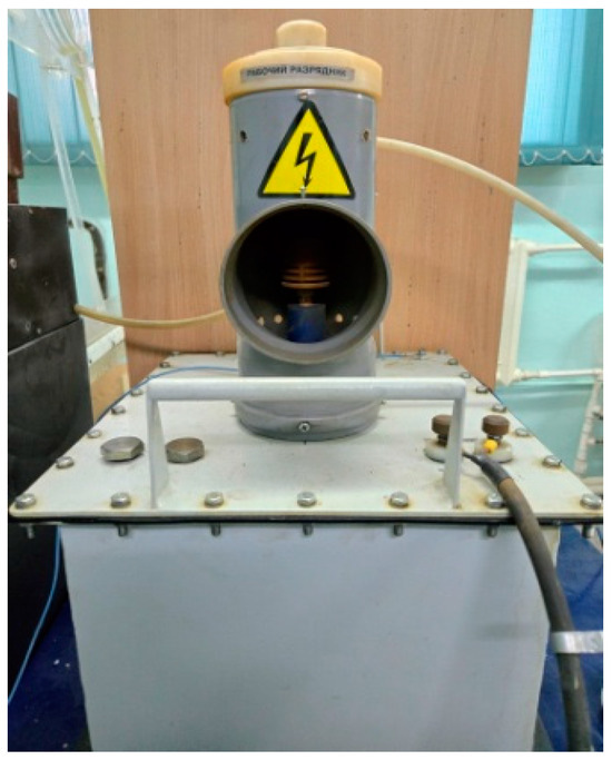 The generator with a forming gap is one of the main components of the installation (see Figure 2). In the experimental researches, pulse capacitors (see Figure 3) with a nominal voltage of up to 100 kV and capacities of C = 0.25 μF (4 pcs) and C = 0.4 μF (5 pcs) were used. The technical characteristics of the installation are given in Table 1. The installation is designed to operate under the following conditions: air temperature from +5 to +40 °C, relative humidity up to 80% at +30 °C, and the absence of conductive dust and chemically active vapors that could damage the insulation of conductive wires and devices.