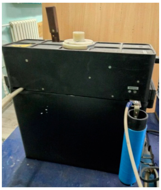 The container (reservoir) of the working chamber for grinding coal is made of stainless steel grade 08X18H10, belonging to the austenitic group of alloys (see Figure 5). High-chromium austenitic stainless steel grade 08X18H9 was used as the electrode (positive electrode) powered by the power source of the installation. The positive electrode was insulated with fluoroplastic F-4 and attached to the upper part of the working chamber. The fluoroplast served as the lid of the working chamber and also served as an electrical insulator between the positive and negative electrodes. The negative electrode was the inner surface of the reservoir bottom.