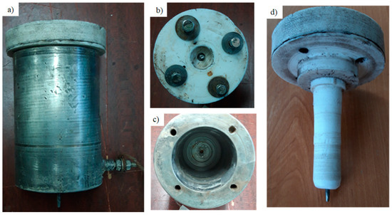 Figure 5. Working chamber for grinding coal: (a) working chamber; (b) top view of the working chamber lid; (c) the inner surface of the reservoir of the working chamber; (d) a positive electrode insulated with fluoroplastic.