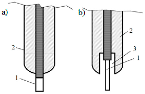 Figure 6. The positive electrode: (a) the outer part of the front end of the positive electrode is completely insulated with fluoroplast; (b) if there is a space between the insulation and the electrode; 1—metal rod; 2—fluoroplast; 3—the space between the metal electrode and its insulation.