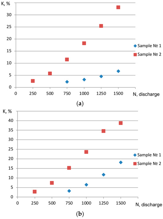 From Figure 8, it can be seen that increasing the capacitor capacity—(a) C = 0.25 μF, (b) C = 0.5 μF, (c) C = 0.75 μF, and (d) C = 1 μF)—and the number of pulse discharges (N = 250–1500) increases the yield of the final product. This was achieved when the positive electrode system in the coal grinding chamber had a special space between the metal rod and the insulation (compared to the sample of electrode № 1, that is, with the results of obtaining carbon powder, when the outer part of the front end of the positive electrode is completely insulated with fluoroplastic).
