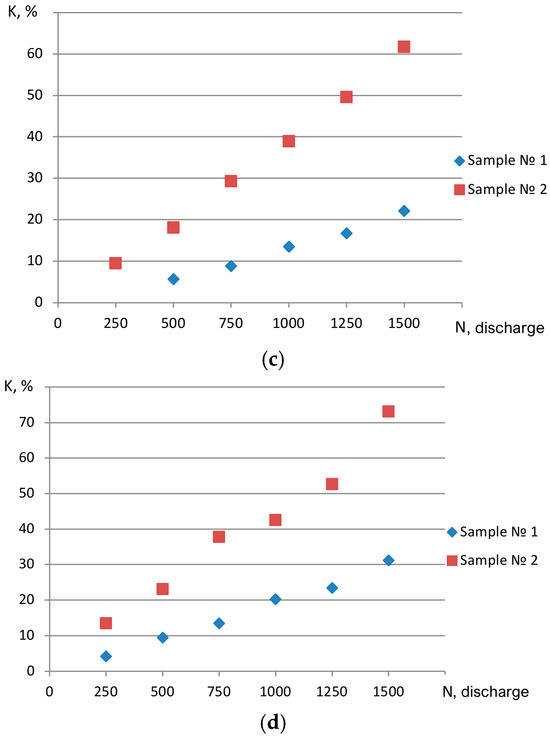 Figure 8. Dependence of the yield of the finished product on the capacity of the capacitor and the number of pulse discharges: sample № 1—the outer part of the front end of the positive electrode is completely insulated with fluoroplastic; sample № 2—in the presence of space between the insulation and the electrode (S = 3 mm); (a) C = 0.25 µF; (b) C = 0.5 µF; (c) C = 0.75 µF; (d) C = 1 µF.