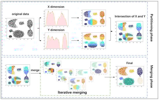 Clustering algorithms based on the partition–merge strategy have gained favor among researchers for their ability to overcome the limitations of traditional clustering methods. Clustering by combining k-means with the density- and distance-based method (KMDD) [31] is a classical clustering algorithm following the partition–merge strategy, which combines both k-means and density in order to quickly find the structure of the data in the space. In the partitioning phase, KMDD uses k-means to divide the dataset into a number of smaller spherical clusters and assigns the corresponding local densities. In the merging phase, the initial subclusters are merged by manually selecting the cluster centers from the decision graph following the feature that the cluster core density is higher than the density of neighboring subclusters at a greater distance. KMDD accurately identifies clusters of various shapes, but the optimal k-value is a challenge for the KMDD algorithm. To address the limitations of KMDD, Yuan et al. [32] proposed a clustering algorithm called Beyond K-Means++, which explores clusters through local geometric information. To overcome the dependence on k, the algorithm automatically increases or decreases k starting from 1 as clusters split and merge, thereby not only avoiding k-dependence but also enhancing clustering accuracy. To address the limitations of the DPC algorithm’s poor performance on popular datasets and its high dependence on the cutoff parameter, Ding et al. [17] proposed a division and merging algorithm called an improved density peaks clustering algorithm based on natural neighbor with a merging strategy (IDPC-NNMS), which combines peak density and natural nearest neighbors. IDPC-NNMS adaptively obtains the local densities by accurately identifying the natural neighbors of each data and then defines a novel merging strategy to merge the subclusters. Cheng et al. [33] proposed a split–merge clustering algorithm, a novel projection-based split-and-merge clustering algorithm (PSM) using projection techniques, which extends projection techniques to K-means to select the initial cluster centers and then determines the distribution of clusters by the distribution of density profiles. Experiments show that PSM performs well under strict data conditions.