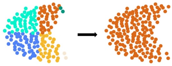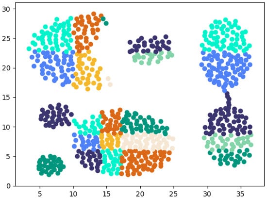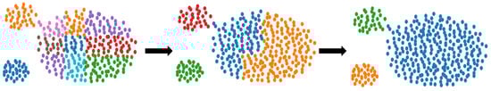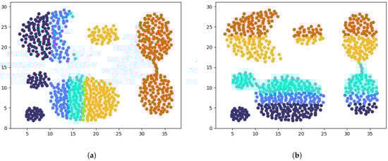 The similarity between all subclusters is calculated based on the traversal of Equation (9). After obtaining the similarity between subclusters, the similarity of all subcluster pairs is sorted in descending order, and the subclusters with maximum similarity and closer distance are merged. In addition, the merging process is performed iteratively until the desired number of clusters is reached, which means that new clusters generated during the merging process can be evaluated again with respect to whether to merge them or not by the similarity metrics, and the merging process reduces the time complexity, particularly when there are more than two subclusters with maximum similarity in the merging process. For example, if multiple subclusters have the same maximum similarity as shown in Figure 6, then they can be merged simultaneously.
