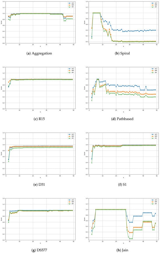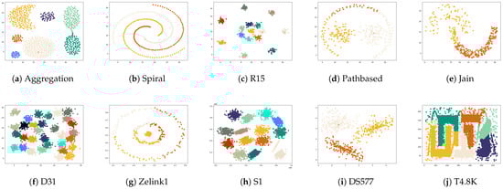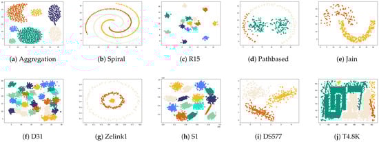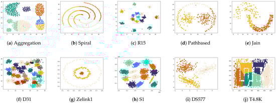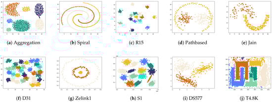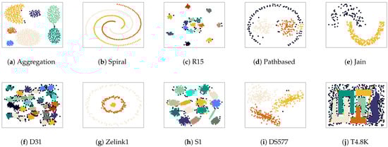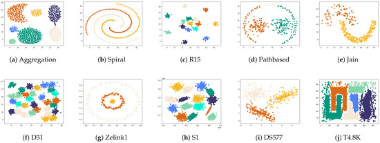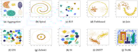 Ten synthetic datasets and ten UCI real datasets were prepared for this experiment, and the detailed information of these datasets is displayed in Table 3 and Table 4, including the data size, dimensions, and the number of real clusters. All datasets were obtained from https://github.com/Chelsea547/Clustering-Datasets (accessed on 21 January 2025).