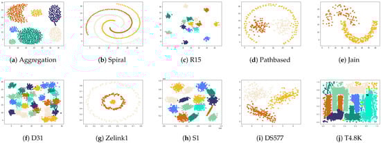 (a–j) show the clustering results of the RNN-DBSCAN algorithm on ten synthetic datasets.